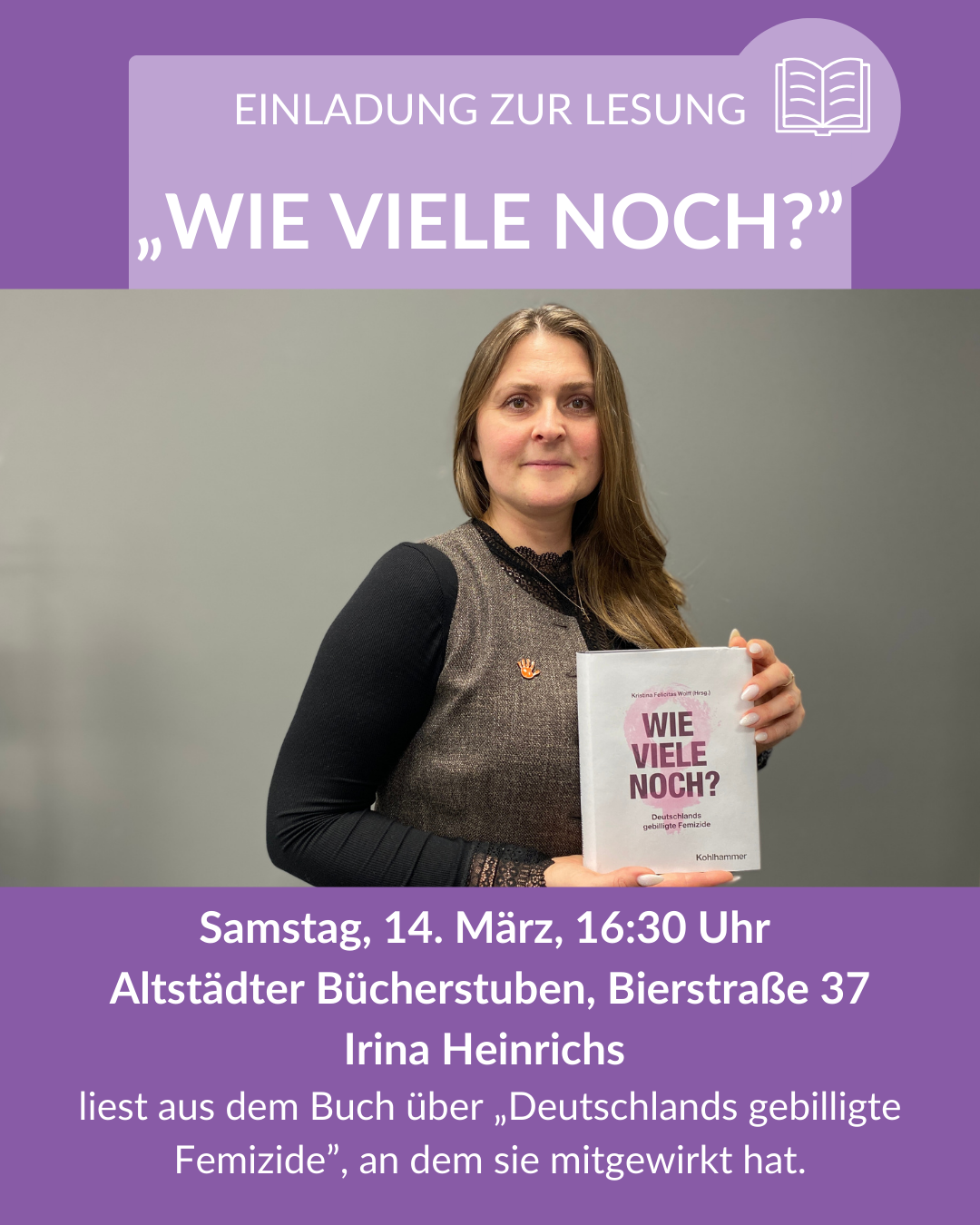 Altstädter Bücherstuben, Bierstraße 37Samstag, 14.03.2026um 16:30 Uhr Irina Heinrichs liest aus dem Buch „Wie viele noch?“, an dem sie mitgewirkt